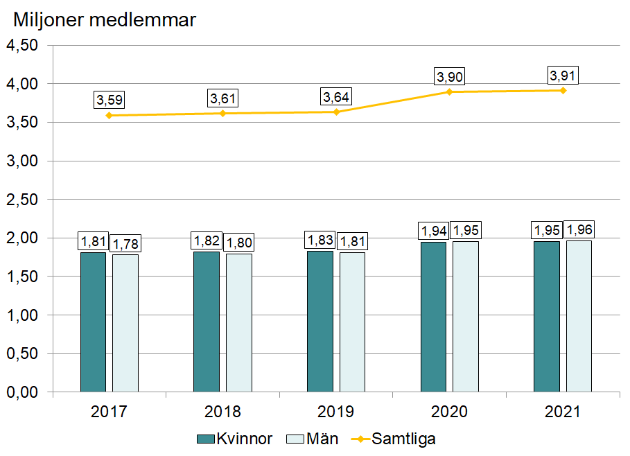 I december 2021 var 3,91 miljoner personer med i en a-kassa. Av dem var 1,95 miljoner kvinnor och 1,96 miljoner män.