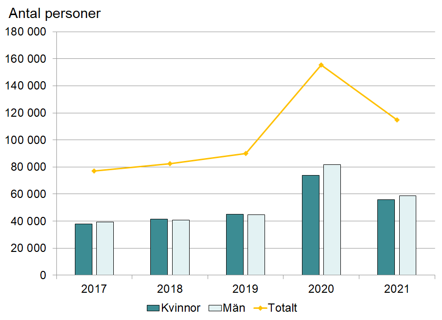 I december 2021 betalades det ut arbetslöshetsersättning till 102 776 personer. Av dem var 48 486 personer kvinnor och 54 290 män.